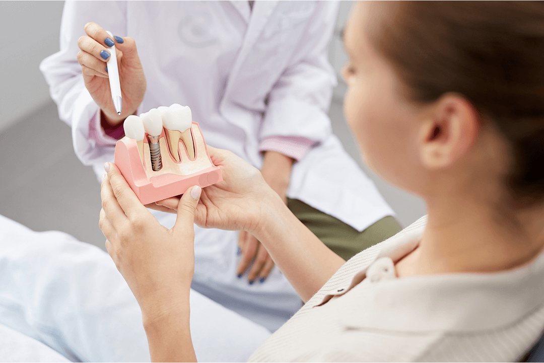 A dental implant is a small, biocompatible titanium post that replaces the root of a missing tooth. Once placed into the jawbone, the implant fuses naturally with the bone through a process called osseointegration. This creates a stable foundation for a custom restoration, such as a dental crown, bridge, or denture, depending on your needs.